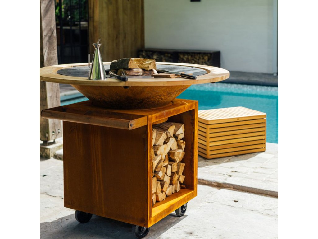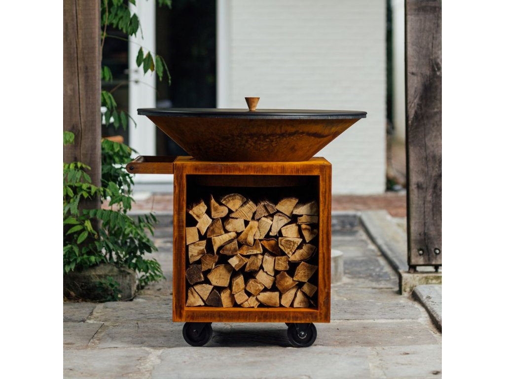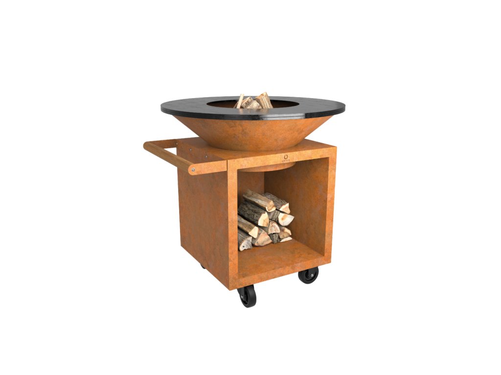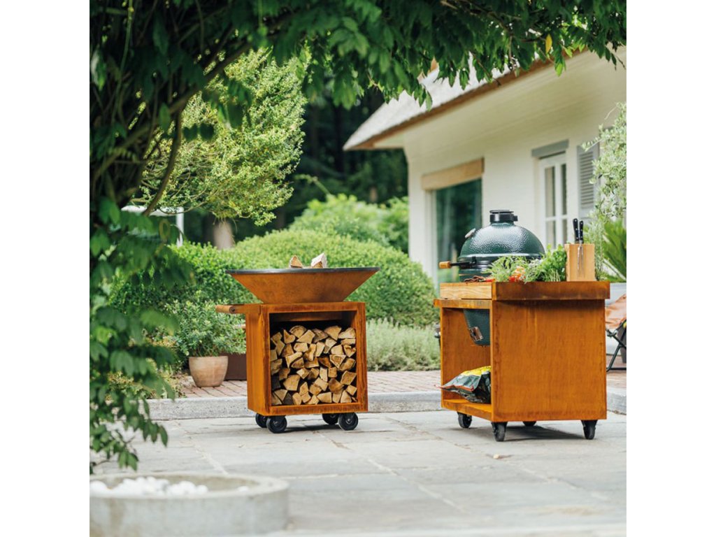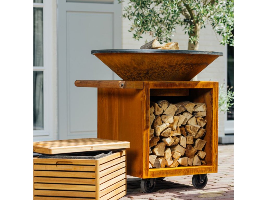 Kortenový OFYR na kolech s plotnou velikosti 100 cm, se zásobníkem na dřevo. Tento nový model s označením "+" má pasivní přisávání vzduchu z podstavce a litinovou vnitřní plotnu "Airflow Plate" díky čemuž spaluje dřevo efektivněji přímo pod plotnou a tím spotřebuje méně dřeva a dosáhne rychleji optimální teploty.