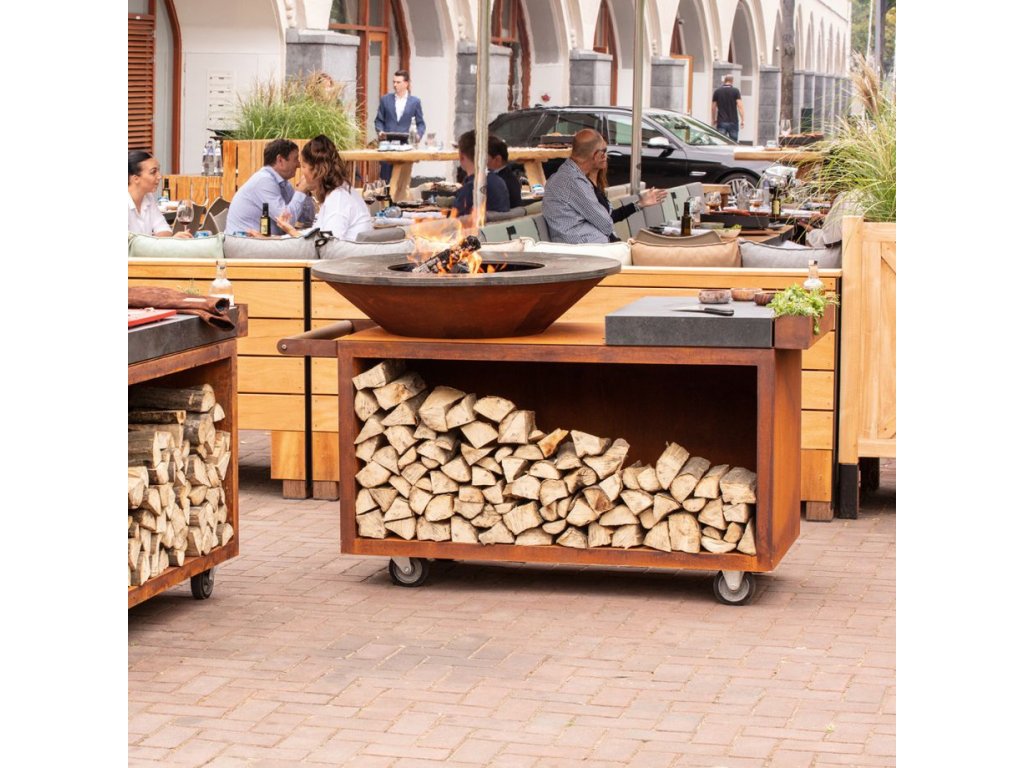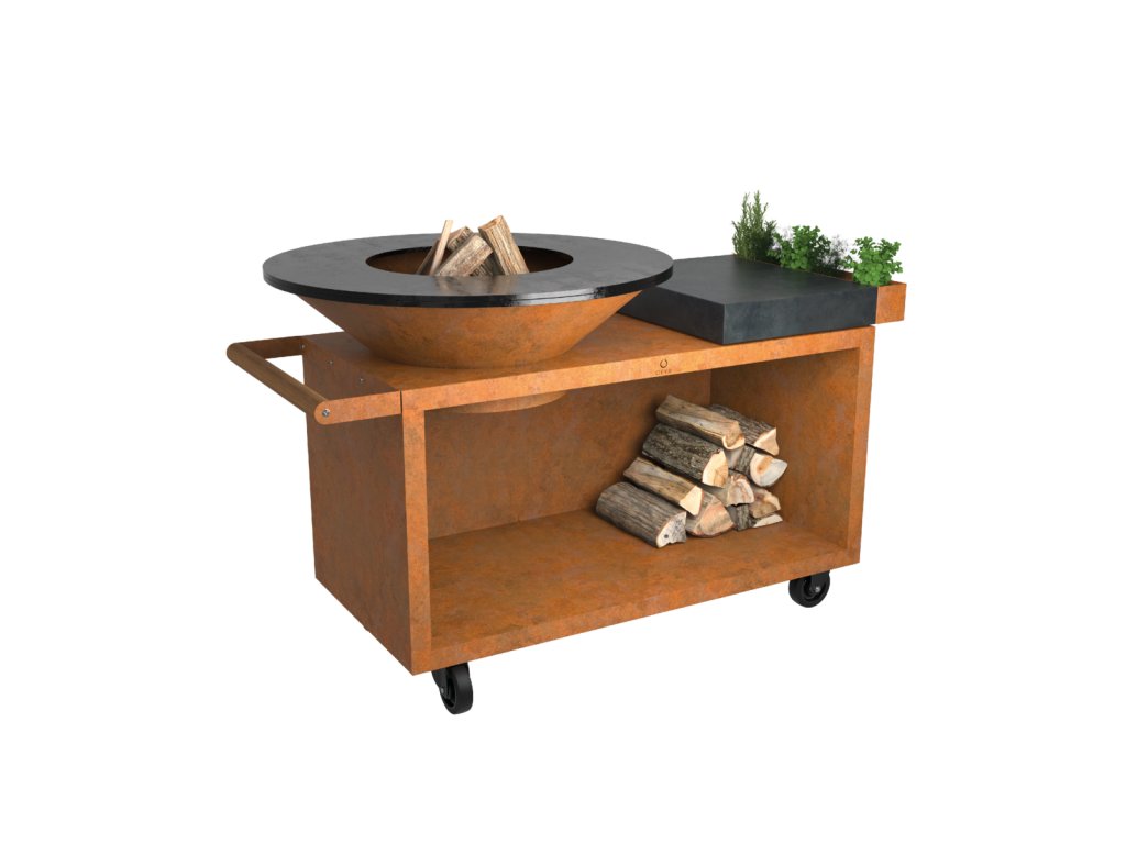 Kortenový OFYR na kolech s keramickou pracovní deskou, plotna 100 cm, zásobník na dřevo. Tento nový model s označením "+" má pasivní přisávání vzduchu z podstavce a litinovou vnitřní plotnu "Airflow Plate" díky čemuž spaluje dřevo efektivněji přímo pod plotnou a tím spotřebuje méně dřeva a dosáhne rychleji optimální teploty.