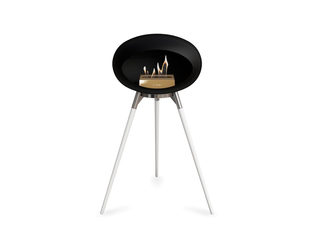 Přenosný biokrb LeFeu DOME GROUND HIGH Black. Kopule: Černá, nožičky: Bílé, trojnožka: Leštěná ocel, kartuš: Rose Gold