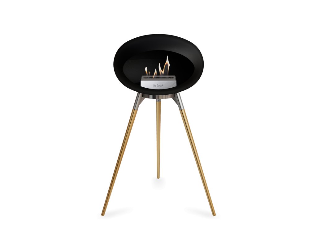 Přenosný biokrb LeFeu DOME GROUND HIGH Black. Kopule: Černá, nožičky: Rose Gold, trojnožka: Leštěná ocel, kartuš: Nerez
