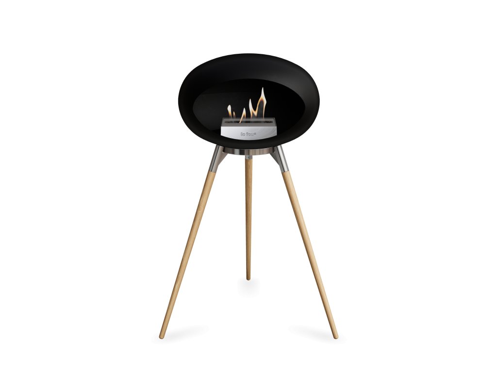 Přenosný biokrb LeFeu DOME GROUND HIGH Black. Kopule: Černá, nožičky: Světlý dub, trojnožka: Leštěná ocel, kartuš: Nerez