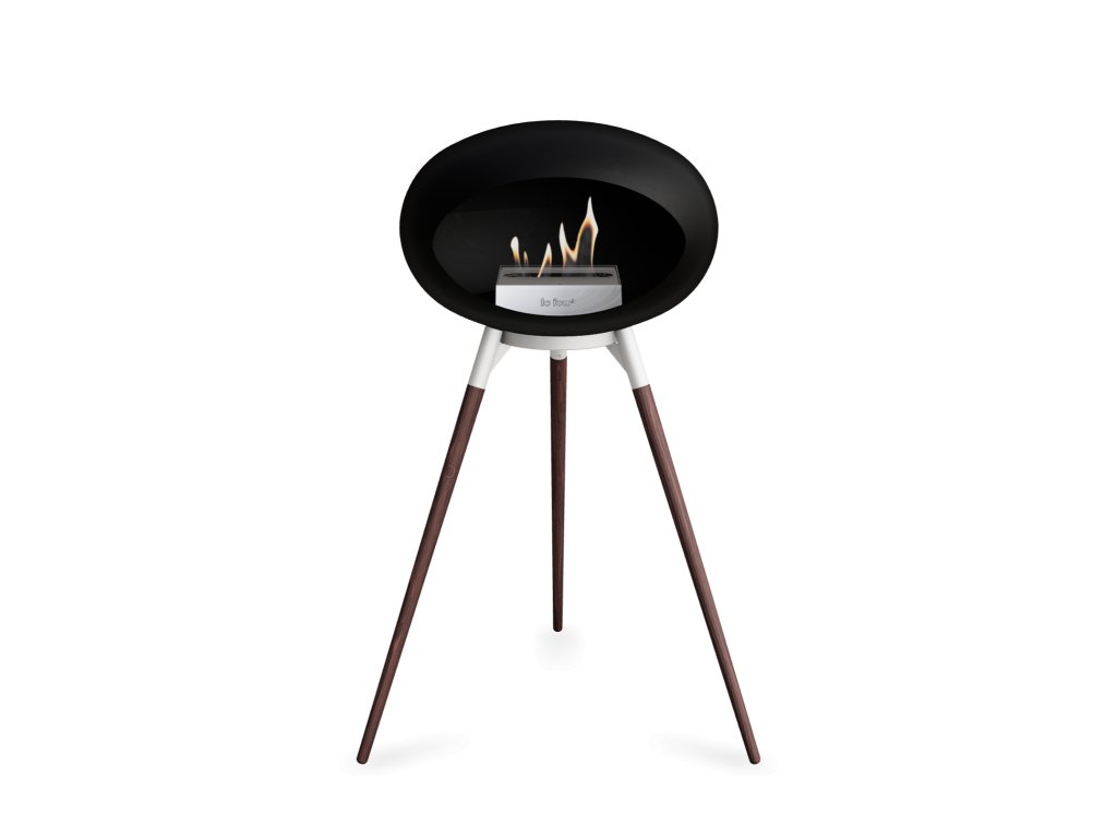 Přenosný biokrb LeFeu DOME GROUND HIGH Black. Kopule: Černá, nožičky: Tmavý dub, trojnožka: Bílá, kartuš: Nerez