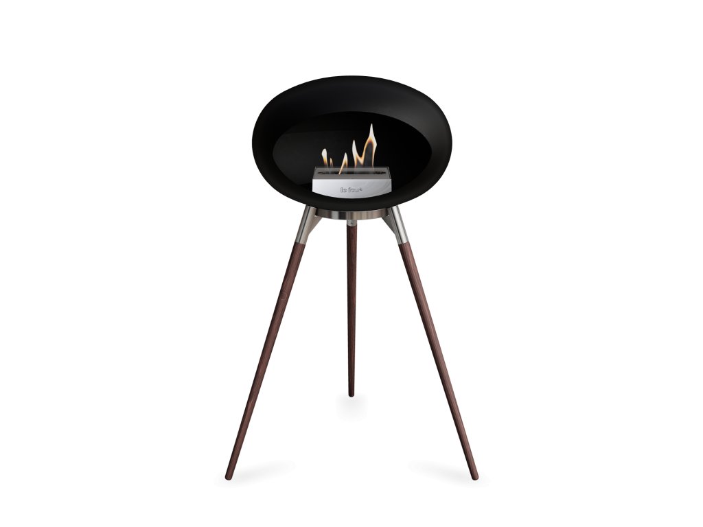 Přenosný biokrb LeFeu DOME GROUND HIGH Black. Kopule: Černá, nožičky: Tmavý dub, trojnožka: Leštěná ocel, kartuš: Nerez
