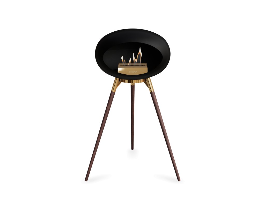 Přenosný biokrb LeFeu DOME GROUND HIGH Black. Kopule: Černá, nožičky: Tmavý dub, trojnožka: Rose Gold, kartuš: Rose Gold