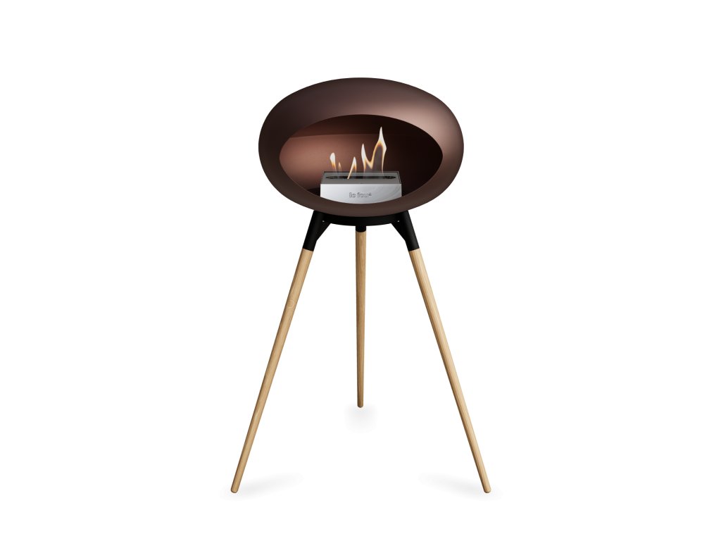 Přenosný biokrb LeFeu DOME GROUND HIGH Mocca. Kopule: Mocca, nožičky: Světlý dub, trojnožka: Černá, kartuš: Nerez