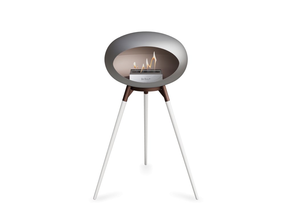 Přenosný biokrb LeFeu DOME GROUND HIGH Nickel. Kopule: Nickel, nožičky: Bílé, trojnožka: Mocca, kartuš: Nerez