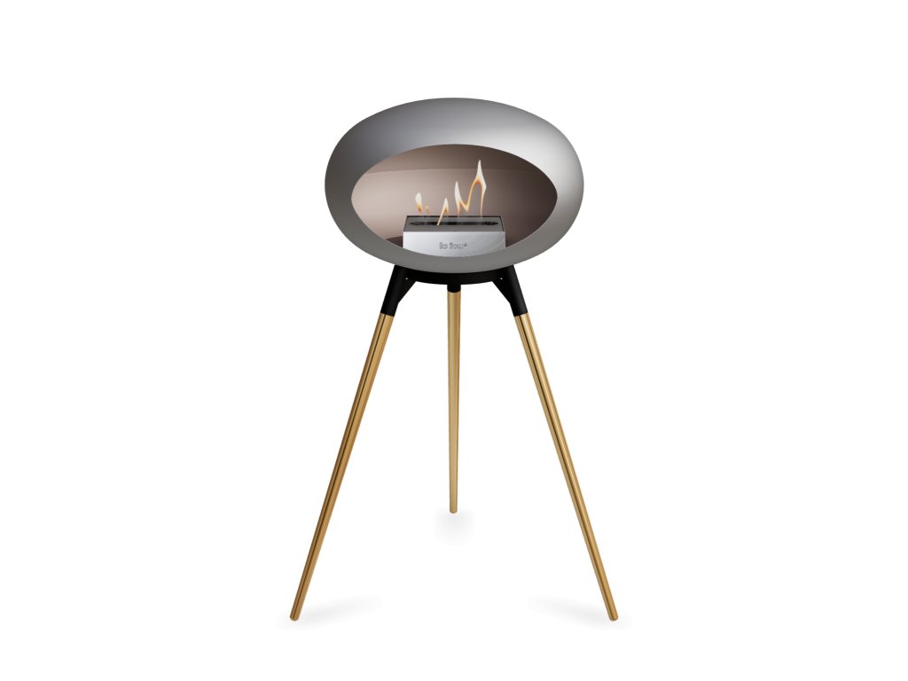 Přenosný biokrb LeFeu DOME GROUND HIGH Nickel. Kopule: Nickel, nožičky: Rose Gold, trojnožka: Černá, kartuš: Nerez