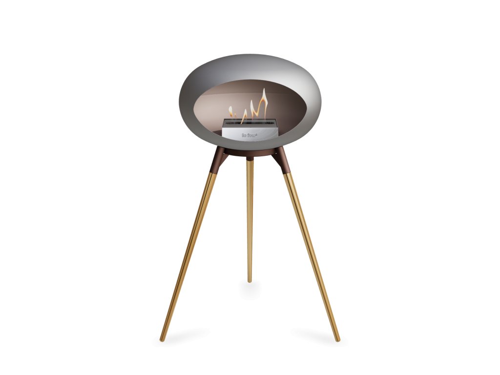 Přenosný biokrb LeFeu DOME GROUND HIGH Nickel. Kopule: Nickel, nožičky: Rose Gold, trojnožka: Mocca, kartuš: Nerez