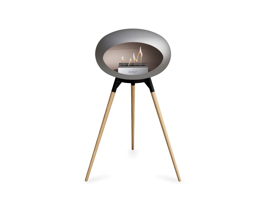 Přenosný biokrb LeFeu DOME GROUND HIGH Nickel. Kopule: Nickel, nožičky: Světlý dub, trojnožka: Černá, kartuš: Nerez