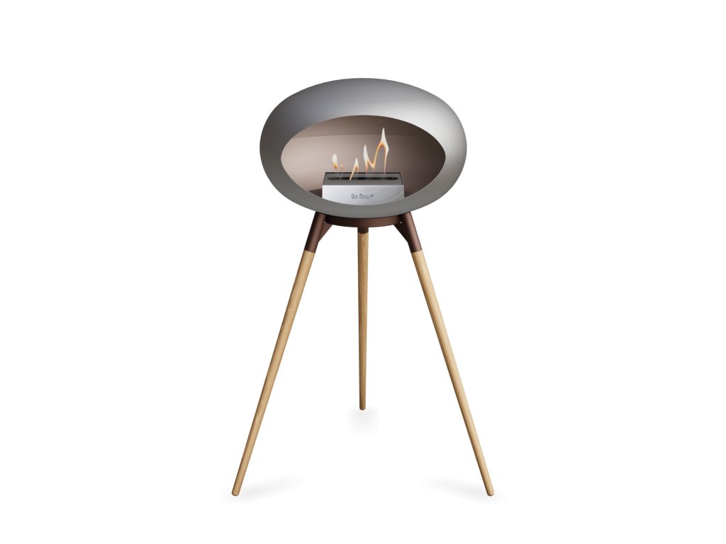 Přenosný biokrb LeFeu DOME GROUND HIGH Nickel. Kopule: Nickel, nožičky: Světlý dub, trojnožka: Mocca, kartuš: Nerez