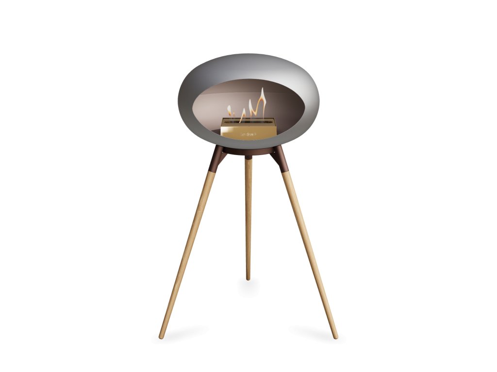 Přenosný biokrb LeFeu DOME GROUND HIGH Nickel. Kopule: Nickel, nožičky: Světlý dub, trojnožka: Mocca, kartuš: Rose Gold