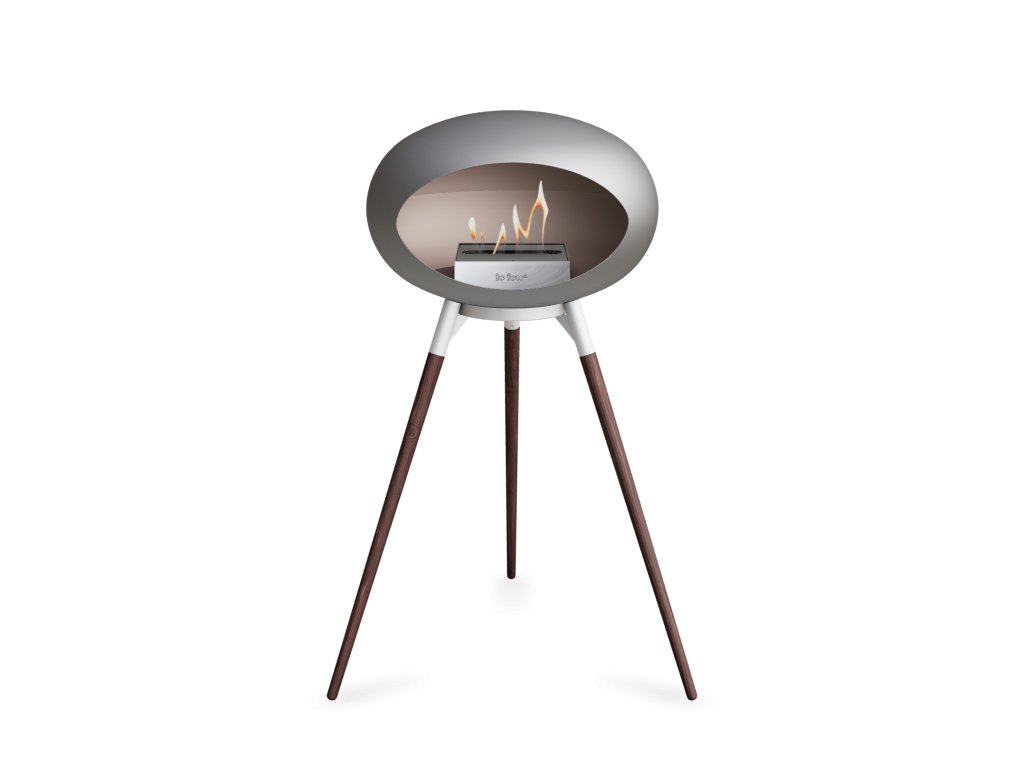 Přenosný biokrb LeFeu DOME GROUND HIGH Nickel. Kopule: Nickel, nožičky: Tmavý dub, trojnožka: Bílá, kartuš: Nerez