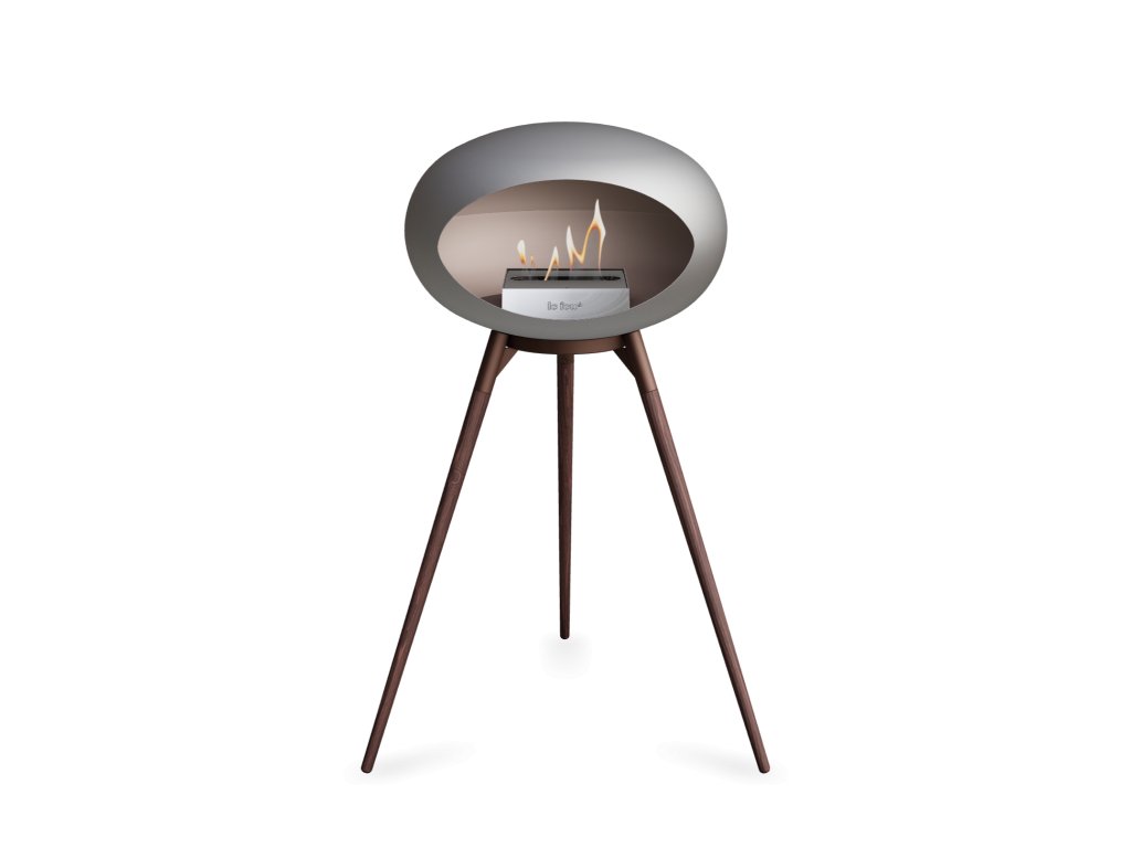 Přenosný biokrb LeFeu DOME GROUND HIGH Nickel. Kopule: Nickel, nožičky: Tmavý dub, trojnožka: Mocca, kartuš: Nerez