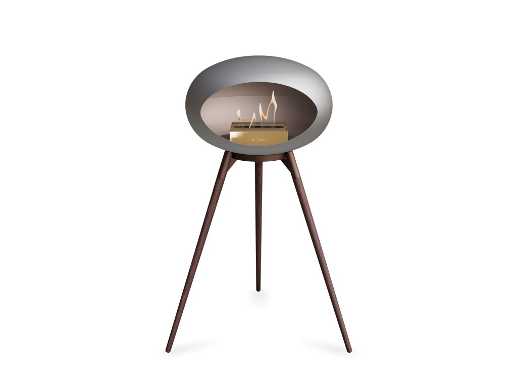 Přenosný biokrb LeFeu DOME GROUND HIGH Nickel. Kopule: Nickel, nožičky: Tmavý dub, trojnožka: Mocca, kartuš: Rose Gold