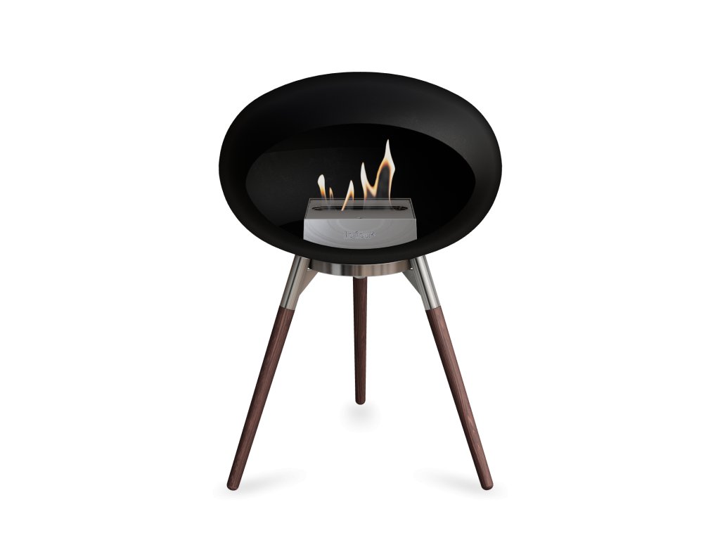 Přenosný biokrb LeFeu DOME GROUND LOW Black. Kopule: Černá, nožičky: Smoked Oak Legs, trojnožka: Polished Steel Bowl, kartuš: Steel