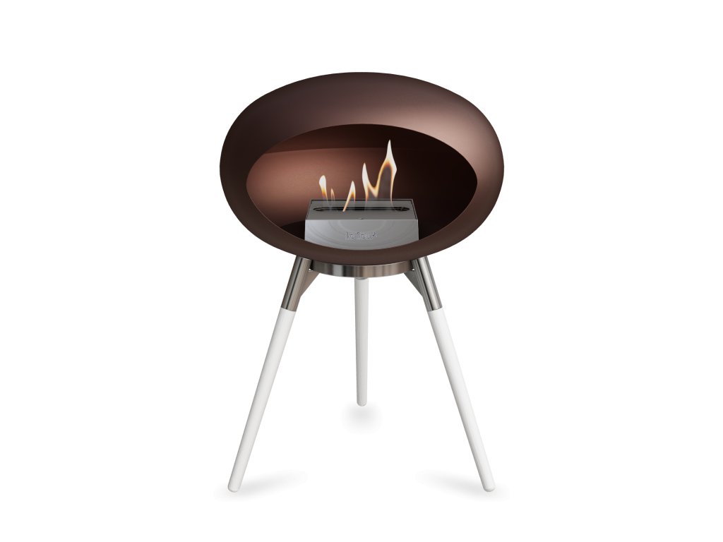Přenosný biokrb LeFeu DOME GROUND LOW Mocca. Kopule: Mocca, nožičky: White Legs, trojnožka: Polished Steel Bowl, kartuš: Steel