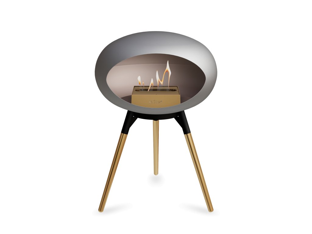 Přenosný biokrb LeFeu DOME GROUND LOW Nickel. Kopule: Nickel, nožičky: Rose Gold Legs, trojnožka: Black Bowl, kartuš: Rose Gold