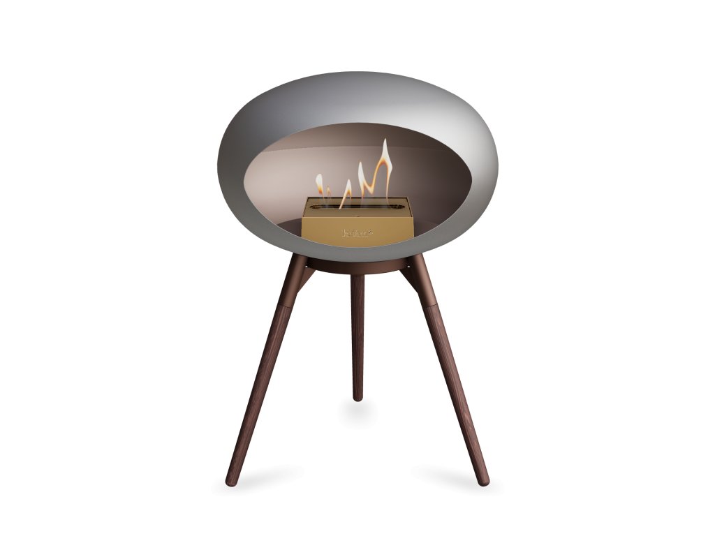 Přenosný biokrb LeFeu DOME GROUND LOW Nickel. Kopule: Nickel, nožičky: Smoked Oak Legs, trojnožka: Mocca Bowl, kartuš: Rose Gold