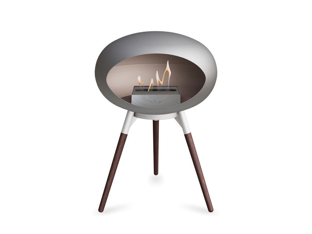 Přenosný biokrb LeFeu DOME GROUND LOW Nickel. Kopule: Nickel, nožičky: Smoked Oak Legs, trojnožka: White Bowl, kartuš: Steel