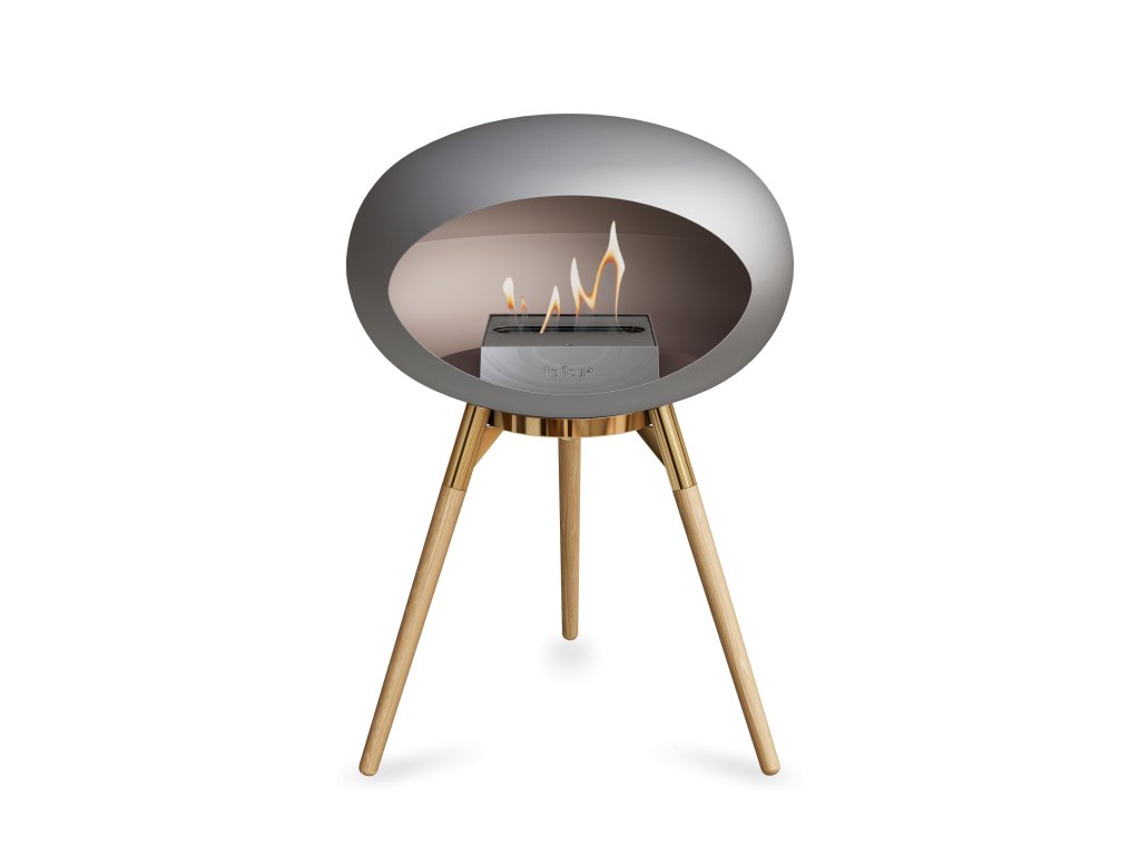 Přenosný biokrb LeFeu DOME GROUND LOW Nickel. Kopule: Nickel, nožičky: Soaptreated Oak Legs, trojnožka: Rose Gold Bowl, kartuš: Steel
