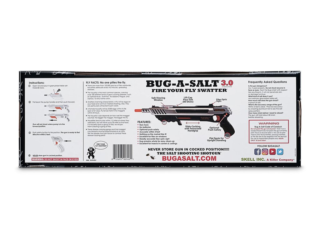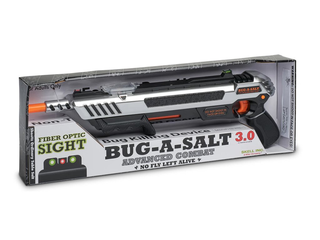 Zabíjení havěti není moc příjemná činnost, pokud ji neumíme provozovat ze správné vzdálenosti a precizně. Bug-A-Salt je účinný ze vzdálenosti asi jednoho metru, účinně likviduje mouchy, komáry, moly a další nepříjemný hmyz. Vypálený solný oblak je bezpečný pro monitory, sklo a nábytek, takže veškerou havěť můžete hubit bez velkého omezení. Po skončení bitvy se vyplatí bojiště zamést nebo vyluxovat. Zařízení nevyžaduje napájení, potřebujete pouze zásobu kuchyňské soli a spoustu dobré nálady.