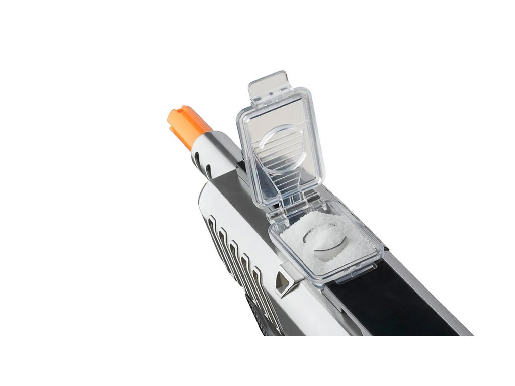 Svým designem připomíná dětskou brokovnici s pumpičkou, vybavenou pojistkou, indikátorem připravenosti ke střelbě, ergonomickou rukojetí a zásobníkem soli. Ke stlačení vzduchu stačí prudký pohyb nabíječe umístěného pod hlavní. Stisknutí spouště vystřelí smrtící nálož hrubé soli proti mouše. Zásobník soli je umístěn v horní části brokovnice, takže doplňování „ munice “ je velmi snadné . Stačí zvednout klapku a nasypat sůl preferovaného „kalibru“. Designéři se také postarali o průhledné okénko, umožňující kontrolu množství dostupné soli.