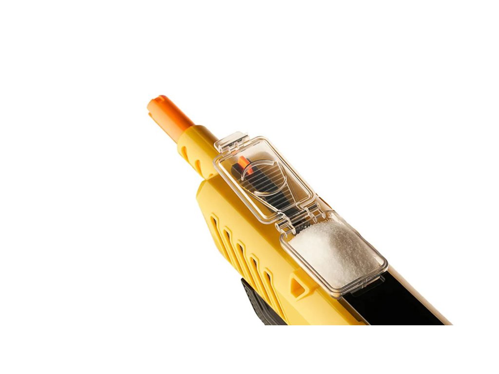 Svým designem připomíná dětskou brokovnici s pumpičkou, vybavenou pojistkou, indikátorem připravenosti ke střelbě, ergonomickou rukojetí a zásobníkem soli. Ke stlačení vzduchu stačí prudký pohyb nabíječe umístěného pod hlavní. Stisknutí spouště vystřelí smrtící nálož hrubé soli proti mouše. Zásobník soli je umístěn v horní části brokovnice, takže doplňování „ munice “ je velmi snadné . Stačí zvednout klapku a nasypat sůl preferovaného „kalibru“. Designéři se také postarali o průhledné okénko, umožňující kontrolu množství dostupné soli.