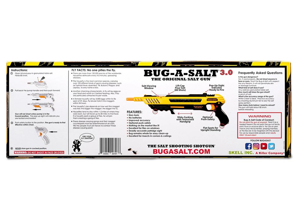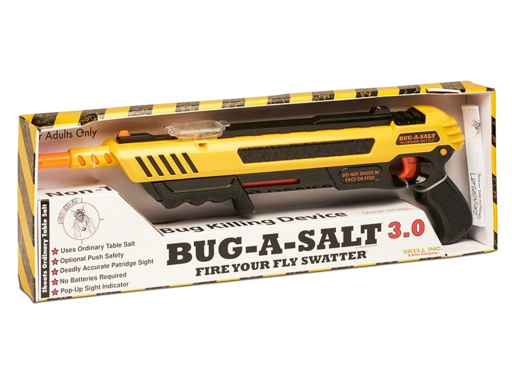 Zabíjení havěti není moc příjemná činnost, pokud ji neumíme provozovat ze správné vzdálenosti a precizně. Bug-A-Salt je účinný ze vzdálenosti asi jednoho metru, účinně likviduje mouchy, komáry, moly a další nepříjemný hmyz. Vypálený solný oblak je bezpečný pro monitory, sklo a nábytek, takže veškerou havěť můžete hubit bez velkého omezení. Po skončení bitvy se vyplatí bojiště zamést nebo vyluxovat. Zařízení nevyžaduje napájení, potřebujete pouze zásobu kuchyňské soli a spoustu dobré nálady.